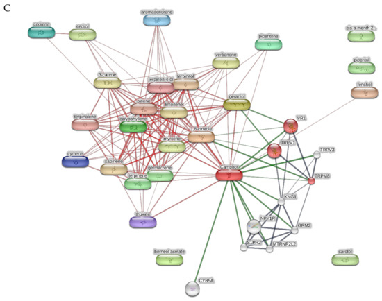 Target component analyses conducted on the bioinformatics platform STITCH for predicting putative proteins targeted by terpene compounds from the hydrosols of rosemary (A), sage (B) and cypress (C). The gene ontology analysis showed the probability of human thermoception pathway (GO: 0050955) modulation by different phytocompounds, including camphor, geraniol, 1,8-cineole, and fenchol.