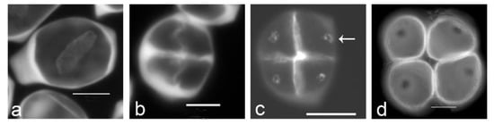 Aperture localization is associated with callose spots in Typha latifolia. (a) Successive cytokinesis with centrifugal cleavage wall formation. (b) Tetragonal tetrad right after cleavage wall formation. (c) Later-stage tetrad with callose spots resulting from additional callose deposition after cleavage wall formation (arrow). (d) Mature tetrad of monoporate pollen grains, callose was dissolved. Tetrads were stained with aniline blue. Scale bars: 10 µm.
