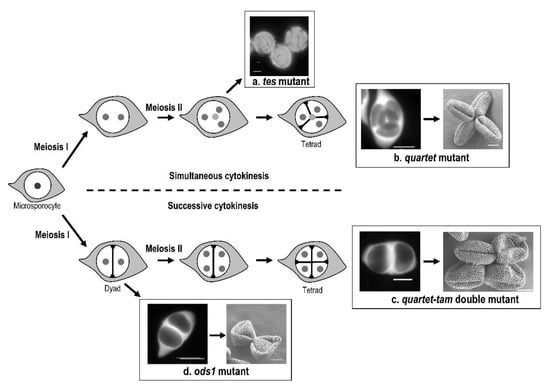 The first report of the role of cytokinesis in the determination of the aperture pattern was through the analysis of the tes/stud cytokinetic mutants of Arabidopsis thaliana [,,]. These mutants present as a primary defect a failure in cytokinesis: the four meiotic nuclei remain within the same cytoplasm (Figure 2a). Therefore, a single microspore is formed and produces a single pollen grain possessing four nuclei. These mutants display extra-apertures in abnormal orientations on the pollen wall, instead of the three colpi that characterize wild-type pollen. The absence of cytoplasm partitioning in tes/stud mutants has multiple consequences, which prevents us from identifying clearly which factors are directly involved in aperture modification. In Albert et al. [], two mutant strains of Arabidopsis thaliana, quartet, and quartet-tam differing only in the type of cytokinesis during microsporogenesis, simultaneous in quartet and successive in quartet-tam, demonstrate the impact of a change from simultaneous to successive cytokinesis in aperture pattern ontogeny (Figure 2b,c). In the quartet mutant, pollen grains are incompletely separated at the end of microsporogenesis, and pollen grains are shed in tetrads, but the aperture number and distribution are unaltered. While the number of apertures is not affected in the tam mutant [], the arrangement of the three apertures within the tetrad is modified compared to the wild type as can be seen by the comparison of the tetrad between quartet and quartet-tam tetrads. Indeed, in the quartet mutant, the three apertures of each microspore are each paired with an aperture of the three other microspores of the tetrad. By contrast in the quartet-tam mutant, the three apertures of each microspore are paired with those of its sister microspore separated by the second meiotic. While the tam mutant produces tetrads of haploid microspores, the cytokinesis mutant osd1 [] does not undergo the second meiotic division and produces dyads of diploid pollen grains instead of tetrads (Figure 2d). The aperture pattern of the resulting pollen grains is modified compared to the wild type since pollen grains are 4-8-aperturate [,].