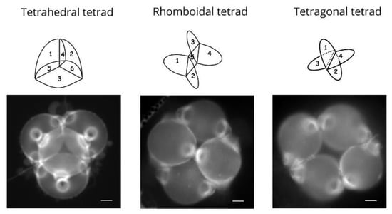 Tetrad form is determined by the localization of nuclei within the microsporocyte [,,,]. Studies have examined the effect of meiotic disturbance by drugs or centrifugation on aperture type, in wheat [] and Lilium henryi [,] which both have pollen grains with a single distal aperture (a pore in the case of wheat and a furrow in the case of Lilium henryi). These studies have showed that distal polar aperture formation is dependent on the position of nuclei in the cytoplasm which in turn affects tetrad form. Variation in the shape of the tetrad also leads to changes in the number of cleavage walls separating the microspores, and therefore to the number of last contact points persisting at the end of cytokinesis. In Nicotiana tabacum cv. Amballema, an increase in cleavage wall number during cytokinesis, which is a modification of the tetrad form, is correlated with an increase in microspore aperture number []. A study in Epilobium roseum (Onagraceae) and Paranomus reflexus (Proteaceae) further demonstrated the role of tetrad form in aperture pattern ontogeny []. Both species produce pollen grains shed in tetrads that may present three different forms within the same anther: tetragonal, rhomboidal, and tetrahedral, with this latter type representing the majority of observed tetrads. Both E. roseum and P. reflexus display pollen heteromorphism since they simultaneously produce pollen grains with two or three apertures. Tetrahedral tetrads are composed of four triaperturate pollen grains, rhomboidal tetrads are composed of two triaperturate pollen grains and two diaperturate pollen grains, and tetragonal tetrads display four diaperturate pollen grains (Figure 3). The differences in aperture numbers are therefore directly associated with variation in tetrad form.