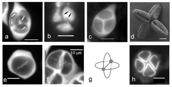 The last points of contact between microspores correspond to the last points covered by callose during the cleavage wall formation. Cleavage wall formation can be centripetal or centrifugal, and the last points of callose deposition are different in number and position in these various situations. In Arabidopsis thaliana, the formation of the cleavage walls is centripetal, and the apertures are localized at the last contact point between microspores (Figure 4). In Nicotiana tabacum, where the formation of the cleavage walls is also centripetal, Ressayre et al. [] have also observed a correlation between the number of last contact points and aperture number. In Asparagus officinalis, cleavage wall formation is centrifugal, and the apertures are oriented toward the last contact points (Figure 4g,h).