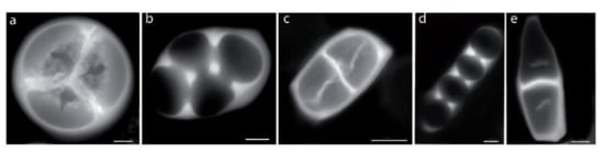 The first study in Codiaeum variegatum var. pictum (eudicots: Euphorbiaceae), which produces inaperturate pollen grains, revealed variation in cytokinesis type, cell wall formation, and tetrad form []. This study was extended to other members of the Euphorbiaceae family and afterward to the eudicots, revealing a similar level of variations in microsporogenesis (Figure 5b–e) [,] and showing that various developmental sequences can be achieved in this clade and therefore an absence of developmental constraints on developmental sequence. The stase in triaperturate pollen grains in eudicots is therefore mostly explained by selection on the aperture pattern.