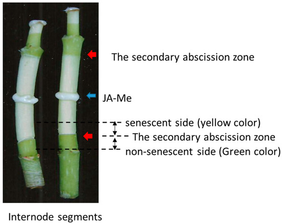 Plant hormones are well known to play an essential role in plant growth and development, including the abscission or induction of transdifferentiation in mature cortical cells. Ueda et al. [28,29] reported that jasmonic acid (JA) and methyl jasmonate (JA-Me) as senescence-promoting substances promoted the abscission of bean petiole explants. JA-Me also promotes leaf abscission in intact Kalanchoe blossfeldiana [30] and B. calycinum plants [31]. Furthermore, Saniewski et al. [31] have reported that JA-Me at a concentration of 0.5% (w/w) applied as a lanolin paste in different stem explants or the debladed petiole induced the formation of the SAZs in B. calycinum. These suggest that JA and JA-Me (designated as jasmonates, JAs) have a powerful effect of inducing the SAZ and developing an abscission zone that has already been initiated in plant tissues, resulting in leaf abscission. Ito and Nakano [32] have suggested that a decrease in auxin levels might be considered to provide the first signal for abscission in pedicel abscission in tomatoes. In the stem of B. calycinum, indole-3-acetic acid (IAA) applied to a decapitated shoot or internode explants totally prevented the formation of the SAZ in the stems induced by JA-Me [31,33]. However, it should be mentioned that only IAA application substantially induces the formation of the SAZ not only in internode explants, petiole segments, and the petiole after excision of the leaf blade but also in decapitated stems in intact plants of B. calycinum [31,33]. It is suggested that in mechanisms of the SAZ formation induced by exogenously applied IAA in the internode of B. calycinum, an auxin gradient is vital, and the gradient results from polar IAA transport from the application site [27,31,33]. However, those phenomena induced by JA-Me have not been reported.