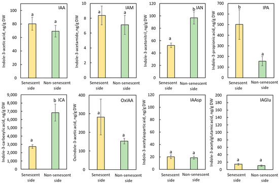 Endogenous levels of auxin-related compounds in the senescent and non-senescent sides of the SAZ induced by JA-Me in the internode explants of Bryophylum calycinum. IAA: indole-3-acetic acid; IAM: in-dole-3-acetamide; IAN: indole-3-acetonitrile; IPA: indole-3-propionic acid; ICA: indole-3-carboxylic acid; OxIAA: 2-oxindole-3-acetic acid; IAAsp: indole-3-acetylaspartic acid; IAGlu: indole-3-acetylglutamic acid. Values are the mean with standard error (n = 6). Different letters on the column (a, b) indicated statistically significant at p < 0.05 after ANOVA.