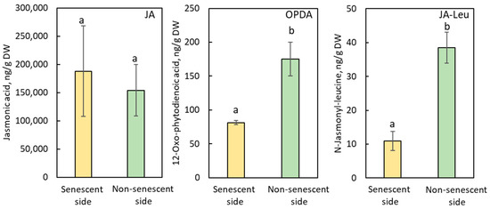 Endogenous levels of jasmonate-related compounds in the senescent and non-senescent sides of the SAZ induced by JA-Me in the internode explants of Bryophyllum calycinum. JA: jasmonic acid; OPDA: 12-oxo-phytodienoic acid; JA-Leu: N-jasmonyl-leucine. Values are the mean with standard error (n = 6). Different letters on the column (a, b) indicated statistically significant at p < 0.05 after ANOVA.