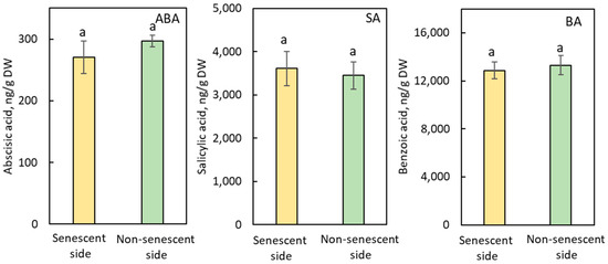 Endogenous levels of abscisic acid (ABA), salicylic acid (SA), and benzoic acid (BA) in the senescent and non-senescent sides of the SAZ induced by JA-Me in the internode explants of Bryophylum calycinum. Values are the mean with standard error (n = 6). Different letters on the column (a) indicated statistically significant at p < 0.05 after ANOVA.