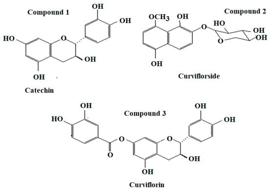 Chemical structures of Compound 1: Catechin; compound 2: Curviflorside; and compound 3: Curviflorin.
