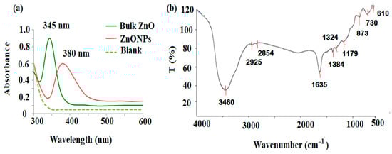 (a) UV-Vis, the absorption spectra at 345 and 380 nm for the bulk ZnO and ZnONPs, respectively; (b) FT-IR of ZnONPs synthesized using P. curviflorus biomass.