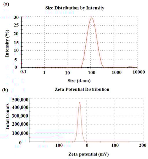 A DLS method was used to determine the distribution and average particle size of the pre-synthesized ZnONPs. The particle size of the ZnONPs obtained was around 100 nm with a tetrahedral crystalline structure (Figure 3a). The surface charge and constancy of the green-synthesized ZnONPs were determined by zeta potential analysis. The results revealed that negatively charged groups present on the surface of ZnONPs were capping molecules that were involved in the average stability of the prepared nanoparticles. The estimation of Zeta potential depends on the movement of nanoparticles under the influence of the applied electric fields. The estimated average zeta potential value obtained for the ZnONPs was −28.4 mV, suggesting the high stability of ZnONPs (Figure 3b).