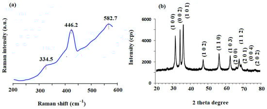 The measurement of Raman scattering was used to evaluate the vibrational characteristics of the ZnO nanostructures at room temperature. This is a non-destructive and very sensitive technique for examining semiconductor nanostructures. The materials containing ZnO wurtzite crystal structures mostly possess hexagonal systems with C6v4 (P63mc) and primitive cells with two formula units where all atoms inhabit C3v sites [52]. Raman spectroscopy exists in active and inactive photon modes, as claimed by the theory. In ZnO, the A1, E1, and 2E2 types represent the active photon mode, whereas the B1 type represents the inactive photon mode [53]. Figure 4a displays the Raman spectrum of biosynthesized ZnONPs. The observed peaks at 446.2 cm−1 and 334.5 cm−1 are due to the E2 (high) mode and 2E2 (medium) modes of wurtzite ZnO, respectively [53,54]. However, the appearance of a small peak at 582.7 cm−1 is a disorder related to the A1 longitudinal optical (A1 LO) mode, that was observed because of oxygen vacancies, structural defects, and Zn interstitials in ZnO [55].