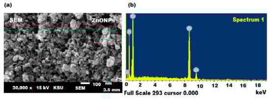 SEM estimation was applied to study the morphological shape of the as-prepared ZnONPs and the selected images are shown in Figure 5a. It was observed that most of the pre-formed ZnONPs were hexagonal in shape and nanometer scale with an average diameter of around 80–100 nm. Moreover, it was noticed that all the prepared amounts of the ZnONPs were similar in dimension, together with an inadequate large particle. Additionally, a slight agglomeration was observed in the biosynthesized ZnONPs, which is predictable for the green synthesis of nanoparticles [57]. Furthermore, the EDX spectral analysis was conducted to examine the topographies of ZnONPs. The results showed that the prepared ZnONPs have a pristine ZnO phase [58]. The EDX examination of ZnONPs showed that the sample contains zinc at peaks around 1, 8.9, and 9.6 keV, whereas a single oxygen peak appeared at ~0.6 keV (Figure 5b) [59]. The high peak intensities of Zn and O confirmed that the sample contains around 94.32 w% of Zn and 5.68 w% O.