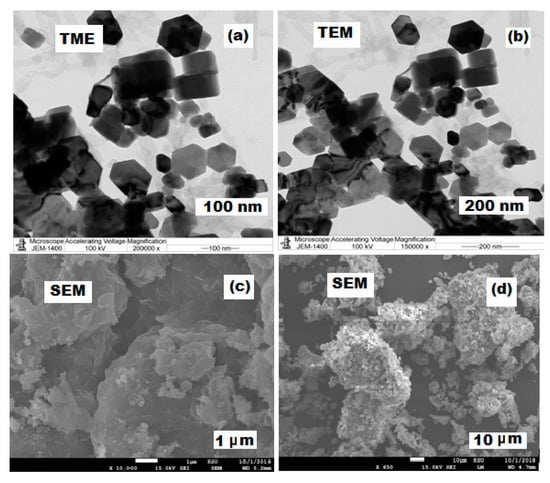Microscopic images of ZnONPs at different magnifications. (a,b) The TEM images of ZnONPs at ×200,000 and ×150,000, 100 kV voltage. (c,d) SEM images at ×10,000 and ×500, 15.0 kV voltage.