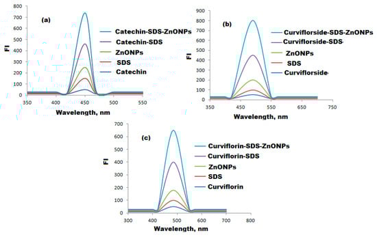 All isolated compounds, catechin, curviflorside, and curviflorin displayed weak emission band strength in phosphate buffer at λem 470, 490, and 484 nm after excitation at λex 380, 420, and 410, respectively. The emission band of each FL system was enhanced by the addition of ZnONPs (Figure 7). The FL analysis was applied to estimate the investigated compounds in the presenceof ZnONPs and catalyst sodium dodecyl suplate (SDS) and ZnONPs. The transfer of intramolecular energy from SDS to the ligand is an established phenomenon [60]. As demonstrated in Figure 7, high emission signals were displayed in the presence of SDS ions due to catechin, curviflorside, and curviflorin, respectively. The addition of colloidal ZnONPs to the systems under investigation has greatly increased FI. Moreover, the literature claims that the free space absorption condition of fluorophores can be modified by metal nanoparticles [61].