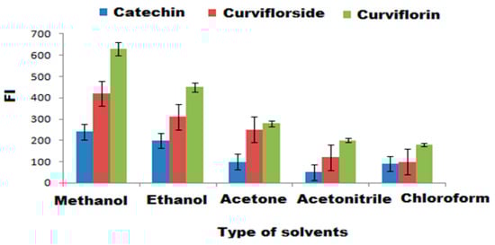 Under optimal conditions, the construction of calibration curves for catechin, curviflorside, and curviflorin was plotted using three different concentrations of the investigated catechin, curviflorside, and curviflorin solutions vs. FI at 12 experimental points. Each testing sample measurement was performed in triplicate. The graphs were fitted using least square linear regression.