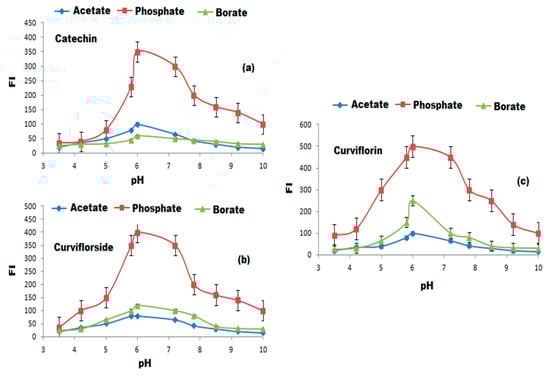 The selection of suitable buffers using 0.2 mol L−1 each of acetate, phosphate, and borate buffers on FI of (a) catechin, (b) curviflorside and (c) curviflorin.