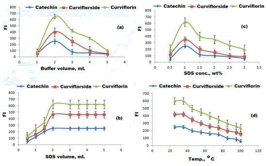 To select a suitable and eco-friendly solvent, different diluting solvents such as methanol, ethanol, acetone, acetonitrile, and chloroform were tested. The highest FI was achieved by diluting the test-isolated compounds with 3 mL of methanol (Figure 8). The influence of buffers the on the FI was tested over the pH range of 3–10 using 0.2 mil L−1 concentration towards borate, acetate, and phosphate buffers.The maximum FI was recorded after adding 0.2 mol L−1 of phosphate buffer of pH = 6 to the selected compounds (Figure 9a–c). The gradual increase in phosphate buffer volume (1.0–5.0 mL) was executed to examine the influence of buffer volume. The maximum FI was achieved by the addition of 2.0 mL of 0.2 mol L−1 phosphate buffer of pH 6 for the three suggested FL systems in the presence of SDS and ZnONPs. The effect of SDS concentration and volume on the FI systems in the presence of ZnONPs was tested in the range of 0.5–3% and 0.5–5.0 mL, respectively. The suitable volume and concentration of SDS to achieve the highest FI was 2.0 mL of 1.0% of SDS in the presence of 1.0 mL ZnONPs (Figure 10a–c). The effect of reaction time on the FI was investigated and the reaction was found to be dramatically faster, the FI attained a persistent value within 2 min, and stayed constant for 3 h for the three systems. On the other hand, the FI of the studied systems might be affected by increasing the temperature. The temperature effect was analyzed thermostatically in controlled temperature ( 25 to 100 °C range) on controlled water bath. The increase in temperature causes a decrease in the FI. Therefore, the room temperature was selected to carry out all the experiments (Figure 10d).