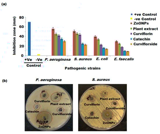 (a) Antibacterial activity of P. curviflorus extract, curviflorin, curviflorside, catechin, and ZnONPs against four pathogens. (b) ZOI against P. aeruginosa and S. aureus bacterial strains.
