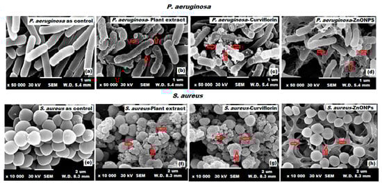 The effect of P. curiflorus extract, curviflorin, and ZnONPs on the surface morphology of P. aeruginosa and S. aureus was investigated under SEM. The shape and size of the selected bacteria were changed upon treatment with P. curiflorus extract, curviflorin, and ZnONPs, as depicted in Figure 12. The ZnONPs showed the highest damage to bacterial cells, as they can easily penetrate the peptidoglycan membrane of P. aeruginosa and S. aureus due to their small size, causing the burst of the cell membrane, releasing the cell content, and subsequently cell demise occurs (Figure 12d,h) [68]. Untreated bacterial cells were chosen for comparison (Figure 12a,e).