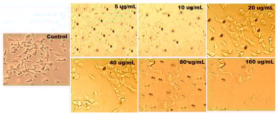 Microscopic images of HeLa cells treated with ZnONPs at different concentrations (5, 10, 20, 40, 80, and 160 μg) for 48 h.