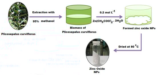 After harvesting, dried shoots of P. curviflorus were collected, thoroughly washed with distilled water, and then kept for drying in an oven for one week at 40 °C. The dried biomass was coarsely powdered to gain a uniform powder. The obtained powder was soaked in 95% methanol for 48 h. The gained P. curviflorus biomass was then utilized for the production of ZnONPs.