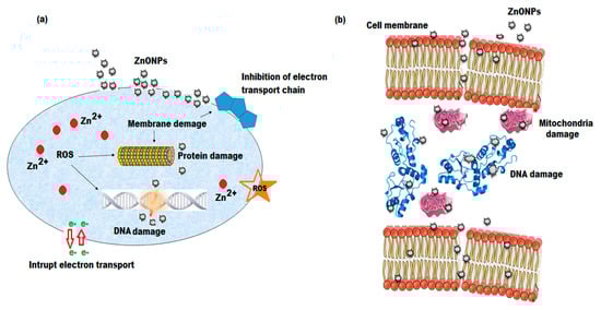 Schematic diagram of (a) antimicrobial and (b) anticancer mechanisms of ZnONPs.