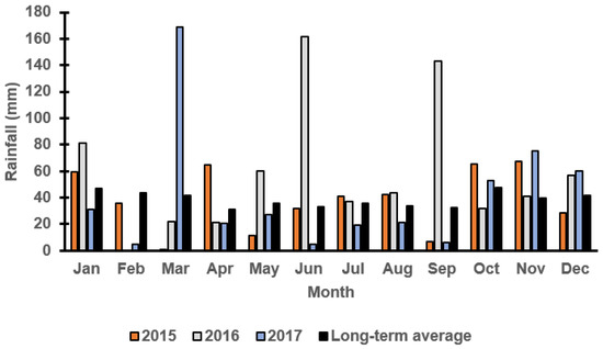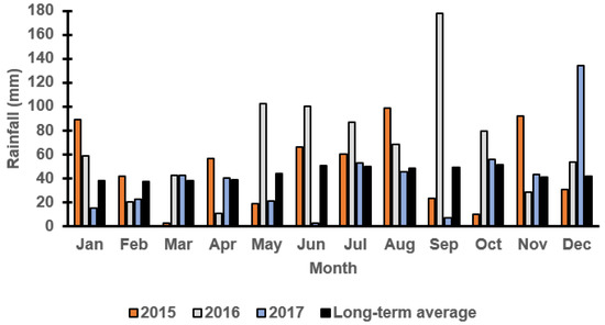Monthly rainfall (mm) at the Wagga Wagga field trial site in 2015, 2016 and 2017 from the Australian Bureau of Meteorology. The long-term average is calculated over the last 100 years.