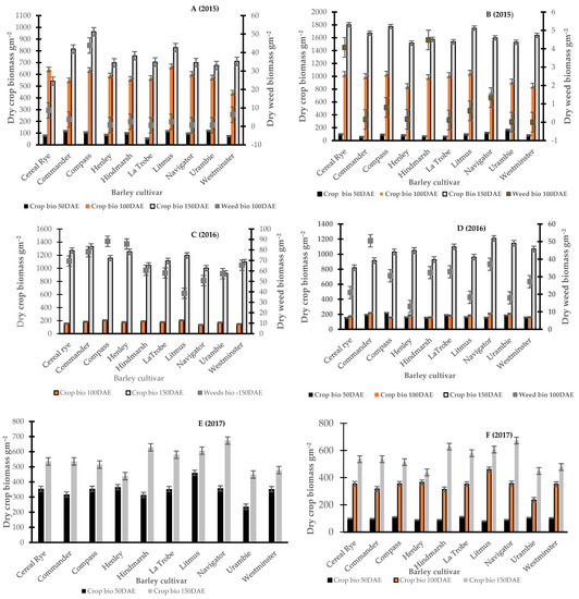 In 2015, at Wagga Wagga (Figure 3B,D,F), early crop biomass differed between cultivars at both 50 (p < 0.001) and 100 DAE (p < 0.001), with Navigator, Compass and Litmus producing up to 10–20% higher average crop biomass and similar reductions in weed biomass (Figure 3). However, there were no differences in crop biomass at 150 DAE. In 2016, above-average rainfall was noted in both locations, and no significant differences between cultivars were noted with respect to crop biomass as soil moisture was not limiting barley growth and canopy development. Subsequently, limited differences in weed interference were noted in 2016 among cultivars at 100 DAE.