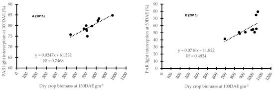 Figure 4 presents a comparative regression analysis between PAR light interception and crop biomass at both locations over each year. A strongly positive relationship was noted in all years (p < 0.001) at both locations, with the only exception being Wagga Wagga in 2016 where this relationship was weak (Figure 4). Here, the relationship was impacted by the timing of PAR reading and crop biomass collection, year and location. At Condobolin, the coefficient of determination (R2) was 0.75 (p < 0.001, Figure 4A), 0.55 (p < 0.001, Figure 4C) and 0.25 (p < 0.01, Figure 4E) in 2015, 2016 and 2017, respectively. Similarly, at Wagga Wagga, the coefficient of determination (R2) was 0.50 (p < 0.001, Figure 4B) in 2015 and 0.67 (p < 0.001, Figure 4F) in 2017. However, R2 was markedly lower in 2016 at 0.06 in the year with high soil moisture, showing limited association and suggesting moisture use efficiency may effectively drive canopy formation and biomass accumulation in certain cultivars in dry years (Figure 4D).
