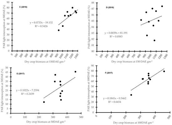 The comparison between photosynthetically active radiation (PAR) light interception and crop biomass at Condobolin (A,C,E) and Wagga Wagga (B,D,F) in 2015, 2016 and 2017 at approximately 50 to 100 DAE for PAR light interception and 50 to 150 DAE for oven dried crop biomass respectively.
