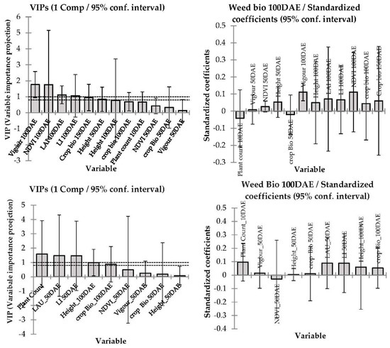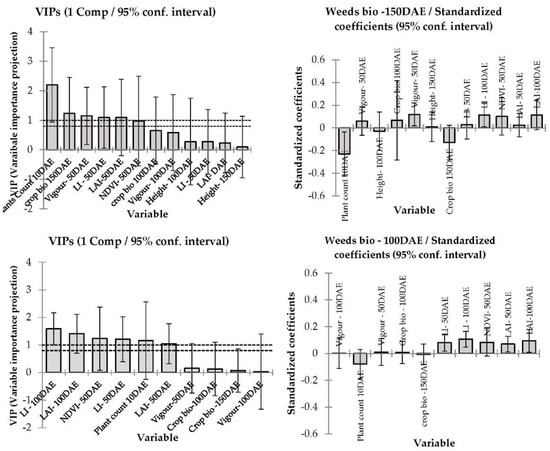 Statistical analysis modelling of the data was performed by linear and partial least squares (PLS) regression for randomised experiments with four replicates using XLSTAT (Addinsoft, New York, NY, USA). Dry weed biomass was used as the dependent variable (or variable to model). In contrast, the quantitative explanatory variables included crop biomass, PAR light interception expressed as a percentage of PAR light intercepted by crop canopy at the sampling time, leaf area index, visual vigour ratings and NDVI, taking into account the time of sampling and crop growth stage. PLS results are presented on the variable importance in model projection (VIP) charts (one bar chart per component); a border line is plotted to identify VIPs that are greater than 0.8 and above. These thresholds allow identification of the variables that are moderately (0.8 < VIP < 1) or highly influential (VIP > 1) [2,31,32]. The VIP score first published by Wold and others in 1993 measures the explicative power of predictor variables with respect to the response variable based on PLS-R. The VIP score of variable j is calculated by Equation (4) below [2]:
