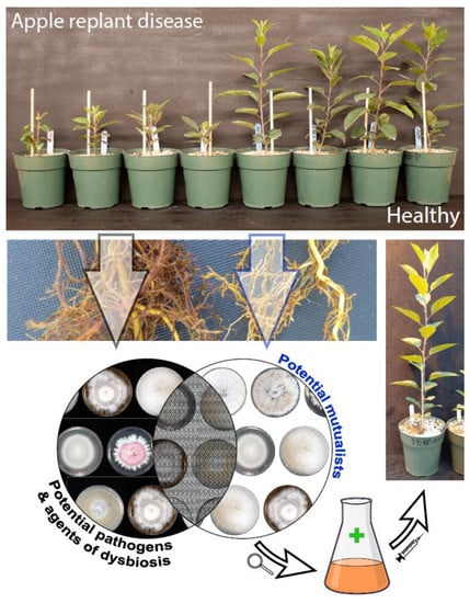 A simplified flow diagram illustrating an approach to isolating, identifying and developing plant health promoting endophytes. This example involves apple replant disease (ARD), a complex phenomenon describing the detrimental physiological and morphological reaction of apple trees in sites that have been repeatedly planted with apple, which can cause a shift towards soil microbiome dysbiosis. The four apple plants on the left show stunting from being grown in pots containing ARD soil, and the four apple plants on the right show good growth and health from being grown in non-ARD soil. Root endophyte and rhizosphere diversity of ARD and non-ARD soils and plants is characterized and compared using a combined approach involving metabarcoding and culturing. Potential pathogens, causal agents and indicators of dysbiosis are identified in ARD samples, and potential mutualists are inferred from non-ARD samples. Mutualistic individuals or consortia are selected as possible ARD biocontrol agents and investigated for their antagonism against ARD-associated pathogens, protective secondary metabolites, plant health promoting interactions and other attributes. Beneficial rhizosphere strains and/or endophyte(s) are then inoculated into soil and/or apple plants for further study, including challenge trials involving inoculated apple planted in ARD soils.
