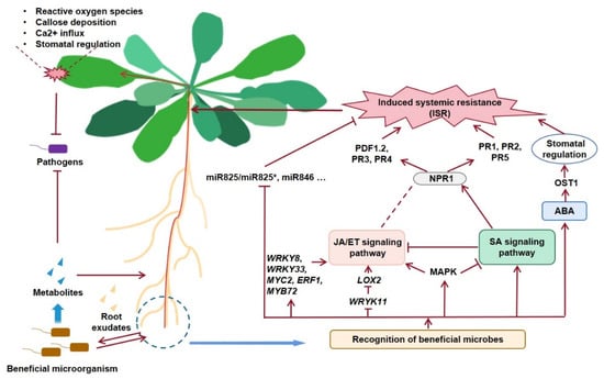 Plant systemic resistance can be divided into induced systemic resistance (ISR) and systemic acquired resistance (SAR), induced by non-pathogenic microbes and pathogenic microbes, respectively [7,8]. Colonization by beneficial microbes induces a physiological state of plant host called “priming”. Upon the activation of “priming”, plants display stronger and faster defense responses against the following invasion of pathogens, demonstrated as a common feature of systemic resistance induced by beneficial microorganisms [9]. SAR was first discovered in 1961 and identified as a salicylic acid (SA)-dependent plant defense, featured by accumulation of SA and activation expression of pathogenic-related (PR) genes [10,11]. In 1991, three research groups independently and specifically evidenced that beneficial microbes enhanced plant immunity by ISR [12,13,14]. Among these three groups, Kloepper et al. found that plant growth-promoting rhizobacteria (PGPR) could induce cucumber systemic resistance to Fusarium-wilt, bacterial angular leaf spot, root-knot nematode, and cucumber mosaic cucumovirus [13,15,16,17,18]. In 1996, Pieterse et al. firstly reported that systemic resistance induced by PGPR was independent of SA and PR proteins in Arabidopsis thaliana, but depended on jasmonic acid (JA) and ethylene (ET) pathway [19,20], which was proposed to be the difference between ISR and SAR. Nevertheless, multiple following reports demonstrating activation of both SA and JA/ET signaling pathways in ISR triggered by beneficial microbes revealed the complexity and diversity of signal pathways involved in ISR [21,22,23,24].