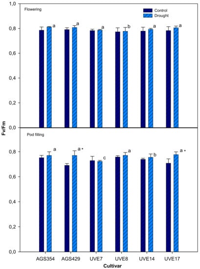 The quantum efficiency of PS II (Fv/Fm) of six edamame cultivars at flowering and pod filling stages under drought stress. Letters (a, b, and c) represent differences or similarities in Fv/Fm between cultivars. Asterisk (*) represents a significant difference under drought stress. Values represent means ± SD (n = 6).