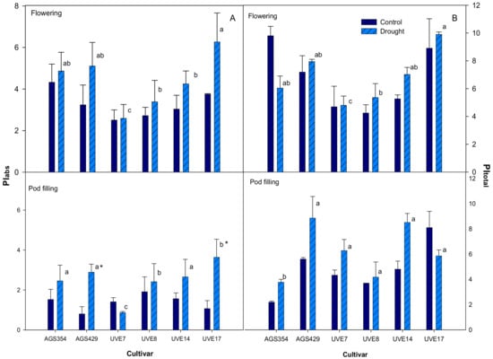 At flowering, PIabs increased with drought stress but the increase was not significant for all cultivars. UVE7 remained unchanged compared to the control and had the lowest PIabs. This cultivar was significantly different from the other cultivars (Figure 2A) under drought stress. At pod filling, PIabs increased with drought stress, except for UVE7, which showed a non-significant decrease with the lowest value. Drought stress significantly increased the PIabs of AGS429 by 72% and UVE17 by 71%, relative to control. UVE7 and UVE8 were significantly different from each other and to the rest of the cultivars under drought stress. UVE17 had the highest PIabs and UVE7 the lowest. PIabs was higher at flowering than at pod filling (Figure 2A). Drought stress increased PItotal for most cultivars at flowering, except for AGS354, which had a decreased PItotal compared to the control. However, the increase of PItotal in other cultivars was not significant (Figure 2B). UVE7 remained the same as the control, had the lowest PItotal and was different from other cultivars under drought stress. At pod filling, drought stress resulted in an increased PItotal for most cultivars, while the PItotal of UVE17 was inhibited. AGS354 was significantly different from other cultivars. PItotal was higher at flowering than at pod filling.