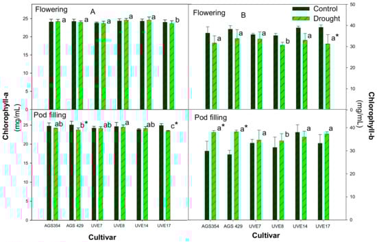 Chlorophyll-a (A) and Chlorophyll-b (B) content of six edamame cultivars at flowering and pod filling stages under drought stress. Letters (a, b, and c) represent differences or similarities in chlorophyll between cultivars. Asterisk (*) represents a significant difference under drought stress relative to controls. Values represent means ± SD (n = 3).