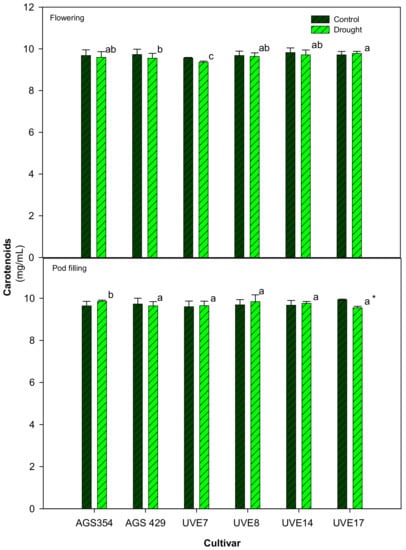 Carotenoids content of six edamame cultivars at flowering and pod filling stages under drought stress. Letters (a, b, and c) represent differences or similarities in carotenoids between cultivars. Asterisk (*) represents significant difference under drought stress. Values represent means ± SD (n = 3).