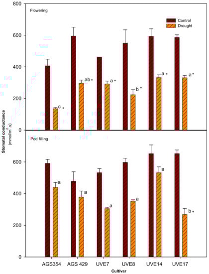 The stomatal conductance of six edamame cultivars at flowering and pod filling stages under drought stress. Letters (a, b, and c) represent differences or similarities in stomatal conductance between cultivars. Asterisk (*) represents a significant difference under drought stress relative to control. Values represent means ± SD (n = 3).