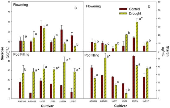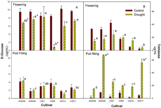 Glucose was significantly reduced in all drought-stressed cultivars, except for UVE7 at flowering. The glucose content was significantly reduced by 90% in UVE8 and by 42% in UVE14 relative to control (Figure 6A). AGS354, AGS429 and UVE17 also showed significant reductions of 29%, 20% and 25%, respectively, compared to the controls. AGS429, UVE7 and UVE17 were not significantly different from each other. AGS354, UVE8 and UVE14 were significantly different from each other and from the other cultivars (Figure 6A). At pod filling, the cultivars were significantly different from each other. In addition, cultivars had lower glucose contents at pod filling compared to flowering (Figure 6A). At flowering, drought stress did not significant affect trehalose content and the cultivars were not significantly different from each other. However, UVE17 showed the lowest trehalose content. On the other hand, UVE14 showed a 3-fold higher trehalose content compared to the control (Figure 6B). At pod filling, drought stress significantly increased trehalose content in AGS429 (by 87%) and UVE17 (by 92%). Under drought stress, AGS354, AGS429 and UVE17 were significantly different from each other and from the other cultivars, whereas UVE7, UVE8 and UVE14 were not significantly different from each other. Cultivars showed a higher trehalose content at pod filling than at flowering (Figure 6B). At flowering, drought stress did not significantly affect the sucrose content for all the cultivars since the cultivars were not significantly different from each other. However, UVE17 showed the lowest sucrose content (Figure 6C). At pod filling, drought stress significantly increased the sucrose content of AGS429 (by 97%), UVE8 (by 49%), UVE14 (by 64%) and UVE17 (by 76%). AGS354 was significantly different from the other cultivars. Sucrose content was higher at pod filling than at flowering (Figure 6C). Drought stress did not significantly affect the starch content for most cultivars, but it was increased by 52% in UVE14 relative to the control. AGS354, UVE7, UVE8 and UVE17 were not significantly different from each other. AGS429 and UVE14 were significantly different from each other and from other cultivars (Figure 6D). At pod filling, drought stress reduced starch production in AGS354, UVE7, UVE8 and UVE14. However, these reductions were insignificant. In contrast, AGS429 showed a significantly higher starch content (42%) compared to the control. Only UVE8 was significantly different from the other cultivars.