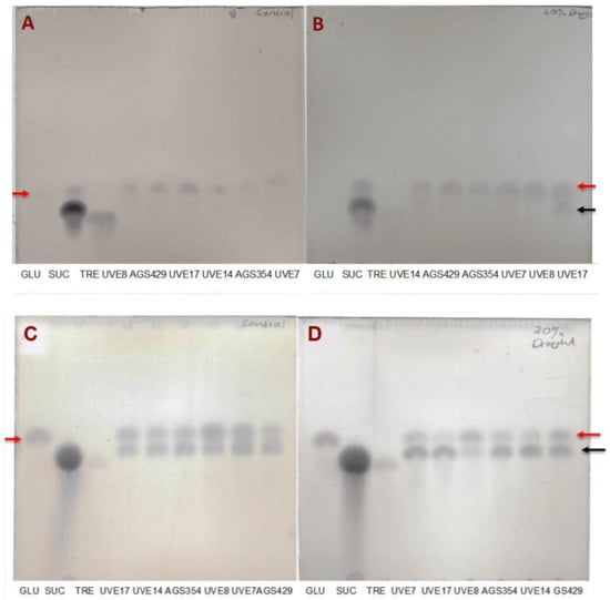 Thin-layer chromatography profiles for soluble sugars in the controls (A,C) and drought-stressed (B,D) edamame cultivars during the flowering stage (A,B) and the pod filling stage (C,D). The red arrow shows the glucose (GLU) and the black arrow represents disaccharides, such as sucrose (SUC) and trehalose (TRE).