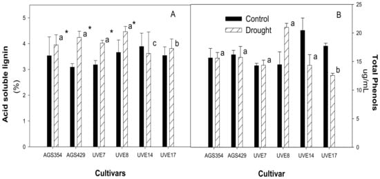 In this study, water treatment and cultivar by water treatment effects were significant (p ≤ 0.01 and p ≤ 0.05) for acid soluble lignin (ASL) (Table S1). Drought stress significantly increased soluble lignin content in the cell walls of AGS354 (by 21%), AGS429 (by 27%), UVE7 (by 20%) and UVE8 (by 17%). UVE14 and UVE17 were significantly different from each other and from the other cultivars under drought stress, whereas AGS354, AGS429, UVE7 and UVE8 were not significantly different from each other (Figure 8A). Drought stress did not significantly affect the total phenol content of all cultivars. Cultivars AGS354, AGS429, UVE7, UVE8 and UVE14 were not significantly different, except UVE17, which was significantly different from the other cultivars under drought stress (Figure 8B).