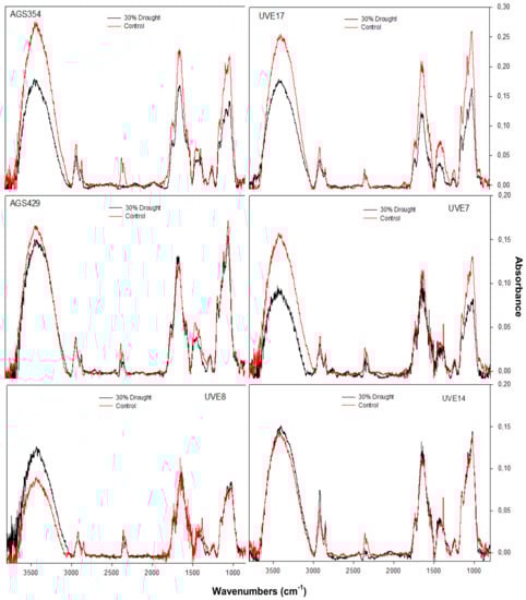 Fourier-transform infrared FTIR spectra of six edamame cultivars exposed to drought stress and the controls. Spectrum for cell wall composition was performed in the region between 4000–800 cm−1 at 4 cm−1 spectral resolution. Each sample was scanned 16× and collected in absorbance mode.