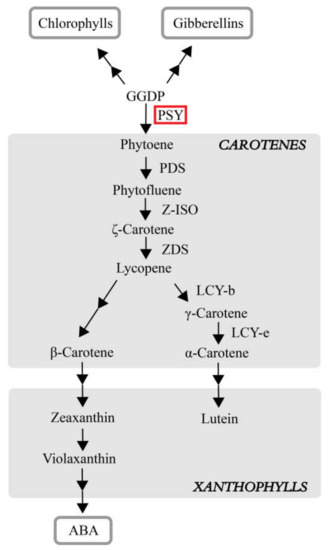 Phytoene is a precursor for the synthesis of all carotenoid substances. Phytoene synthase (PSY), a key enzyme regulating carotenoid synthesis, can catalyze the conversion of geranylgeranyl pyrophosphate (GGPP) to phytoene, which is the first rate-limiting reaction in the carotenoid synthesis pathway (Figure 1) [4,5,6,7]. GGPP also acts as a precursor for gibberellin, abscisic acid (ABA), and chlorophylls [4].