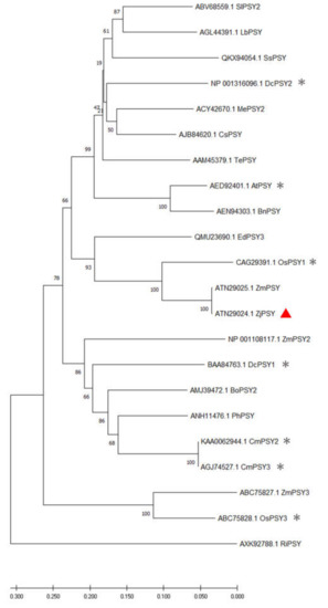 Phylogenetic tree of PSY. Phylogenetic tree analysis among 22 PSY proteins. Protein sequence accession numbers are as follows: SlPSY2 (ABV68559.1), Solanum lycopersicum; IbPSY (AGL44391.1) [19], Ipomoea batatas; SsPSY (QKX94054.1), Salvia splendens; MePSY2 (ACY42670.1), Manihot esculenta; CsPSY (AJB84620.1) [20], Camellia sinensis; DcPSY2 (NP_001316096.1) [21], Daucus carota; TePSY (AAM45379.1), Tagetes erecta; AtPSY (AED92401.1) [22], Arabidopsis thaliana; BnPSY (AEN94303.1), Brassica napus; EdPSY3 (QMU23690.1), Eleocharis dulcis; OsPYS1 (CAG29391.1) [23], Oryza sativa; ZmPSY (ATN29025.1), Zoysia matrella; ZjPSY (ATN29024.1), Zoysia japonica; ZmPSY2 (NP_001108117.1), Zea mays; DcPSY1 (BAA84763.1) [21], Daucus carota; CmPSY2 (KAA0062944.1) [24], Cucumis melo; CmPSY3 (AGJ74527.1) [24], Cucumis melo; BoPSY2 (AMJ39472.1), Bixa orellana; PhPSY (ANH11476.1), Prunus humilis; RiPSY (AXK92788.1), Rubus idaeus; ZmPSY3 (ABC75827.1), Zea mays; OsPSY3 (ABC75828.1) [25], Oryza sativa. ▲ Mark represented the ZjPSY. * Represents the PSY protein was analyzed.