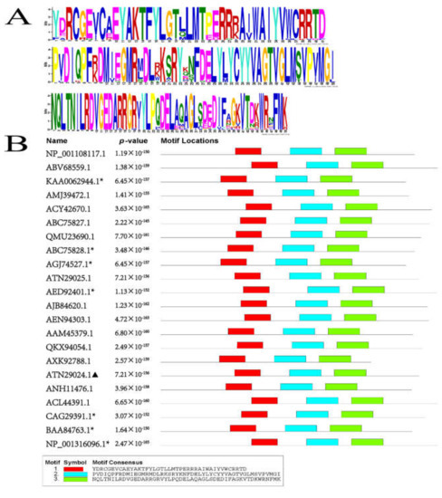 Conserved structure analysis of PSYs. (A) The conserved motifs in 22 PSY proteins of different species. Top scoring three motifs consisting of amino acids composition are listed. (B) Protein motif analyses of PSY protein sequence. Each color shows the different conserved motif structure identified in the PSY protein. ▲ Mark represented the ZjPSY. * Represents the PSY protein has been analyzed.