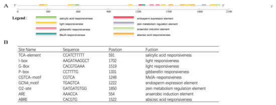 - Lescot, M.; Dehais, P.; Thijs, G.; Marchal, K.; Moreau, Y.; Van de Peer, Y.; Rouze, P.; Rombauts, S. PlantCARE, a database of plant cis-acting regulatory elements and a portal to tools for in silico analysis of promoter sequences. Nucleic Acids Res. 2002, 30, 325–327. [Google Scholar] [CrossRef]
