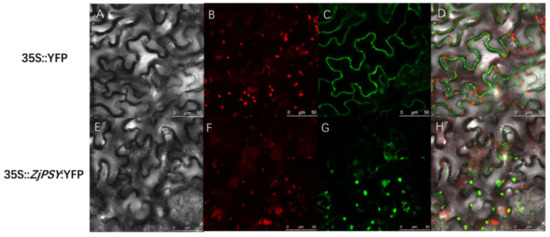 We next sought to examine the subcellular localization of ZjPSY proteins in tobacco leaf via transient transformation. The untargeted YFP was transfected as a control and the fluorescence signal localized in the nucleus and cytoplasm (Figure 5A–D). In the leaf tissue which transiently expressed YFP fusion proteins (35S::ZjPSY:YFP), YFP fluorescence signal colocalized with the autofluorescence of chlorophyll in the chloroplast. The fluorescence accumulated in the chloroplast and cytoplasm (Figure 5E–H), suggesting that ZjPSY mainly localized in chloroplast and cytoplasm.