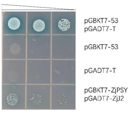 Screening for ZjPSY interacting proteins with yeast two-hybrid assay. Interaction between ZjJ2 and ZjPSY. Yeast cells were spotted on higher stringency QDO/X/A agar plates by 10-fold serial dilutions. Blue clones were positive and white or absent clones were negative. pGBKT7-53 or pGADT7-T was used as the negative control, and pGBKT7-53 and pGADT7-T were co-transformed as positive control.