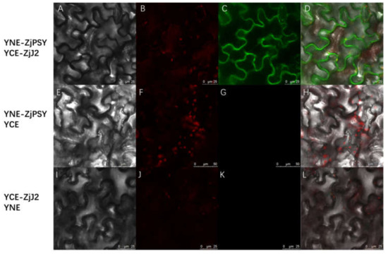 BiFC was used to confirm the interaction of ZjPSY and ZjJ2 in plant cells. ZjPSY and ZjJ2 were fused with the C and N terminals of YFP, respectively, and transiently expressed in tobacco cells. When YNE-ZjPSY and YCE-ZjJ2 were co-expressed, the YFP fluorescence was captured (Figure 7A–D), while no YFP signal was found in negative samples (Figure 7E–L). Those results demonstrated and confirmed the interaction of ZjPSY with ZjJ2.