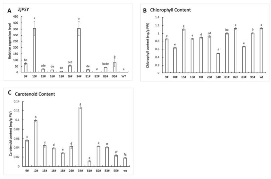 (A) The qRT-PCR analysis of ZjPSY expression in wild-type plants and the transgenic lines. Transgenic line designated #82 was set as calibrator sample with a relative expression equal to 1. (B) Chlorophyll contents of wild-type plants and the transgenic lines. (C) Carotenoid contents of wild-type plants and the transgenic lines. Different letters above the columns indicate significant differences (p ≤ 0.05).