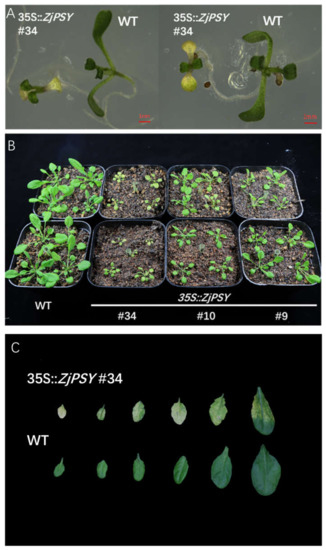 Based on the expression levels and carotenoid and chlorophyll contents, three positive transgenic lines designated #9, #10, #34 were selected for further study of the ZjPSY gene. Grown on MS plates, transgenic seedlings had etiolated cotyledons, showing ZjPSY decreased chlorophyll contents in early stages of transgenic plants (Figure 10A). Grown in soil, transgenic plants displayed dwarf phenotype and senescent leaves compared with the WT (Figure 10B,C). These results suggest that ZjPSY may be involved in leaf pigment accumulation and plant senescence.